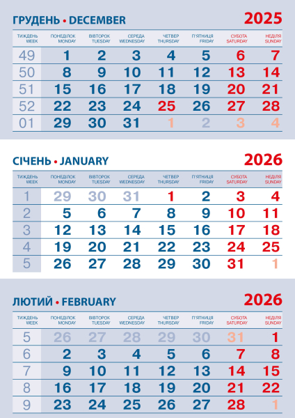 Сетка «Бизнес» выполнена на 2-х (украинский, английский), имеет строгий дизайн, крупный прямой шрифт. В сетке отмечены красным все украинские государственные праздники. Сетка состоит из 12 листов, подобранных в блок. Блоки переложены газеткой и упакованы в пачки по 50 штук.