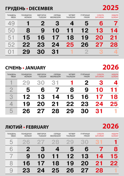 Наші квартальні календарі на 2025 рік пакуються в коробки з гофрокартону по 45-50 штук, що оберігає календарі від застрягання і інших пошкоджень.