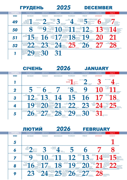 Календарна сітка зі зсв'ятами ШАРА+ синьо-червоний 2026
